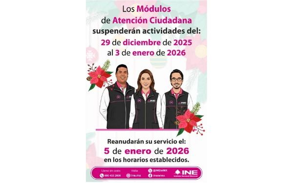 385 Grados / INE / REDACCIÓN / La Junta Local Ejecutiva del Instituto Nacional Electoral (INE) en Tlaxcala dio a conocer que, a efecto de que el personal de los Módulos de Atención Ciudadana (MAC) goce del periodo vacacional decembrino, esas oficinas registrales cerrarán sus puertas del 29 de diciembre del presente año al 3 de enero de 2026.
