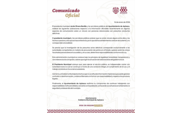 En el documento, fechado el 16 de enero de 2026, el presidente municipal Javier Rivera Bonilla y los servidores públicos del Ayuntamiento aclararon que no existe relación alguna con los hechos o personas a las que se ha hecho referencia, por lo que los señalamientos carecen de sustento y no corresponden a la realidad.