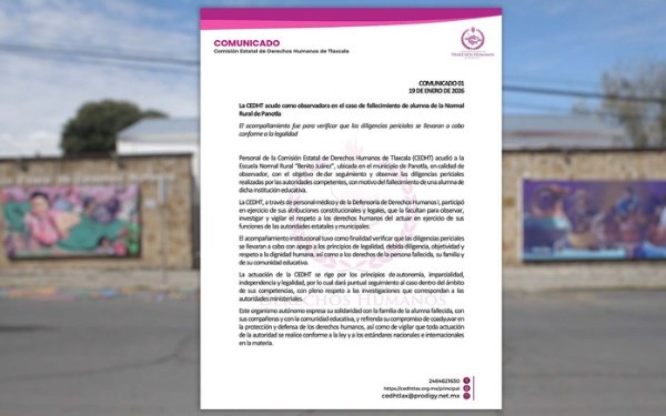 Este organismo autónomo expresa su solidaridad con la familia de la alumna fallecida, con sus compañeras y con la comunidad educativa, y refrenda su compromiso de coadyuvar en la protección y defensa de los derechos humanos, así como de vigilar que toda actuación de la autoridad se realice conforme a la ley y a los estándares nacionales e internacionales en la materia.