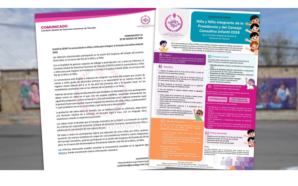 385 Grados / CEDHT / REDACCIÓN / Con la finalidad de generar espacios de diálogo y participación con y para las infancias, la Comisión Estatal de Derechos Humanos de Tlaxcala (CEDHT) emitió la convocatoria a niñas y niños para que integren la Presidencia y Consejo Consultivo Infantil 2026, en el marco del Día de la Niña y el Niño.