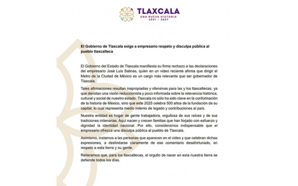 Nuestra entidad es hogar de gente trabajadora, orgullosa de sus raíces y de sus tradiciones milenarias. Aquí nacen y crecen familias que han forjado con esfuerzo y dignidad la identidad nacional. Por ello, consideramos indispensable que el empresario ofrezca una disculpa pública al pueblo de Tlaxcala.