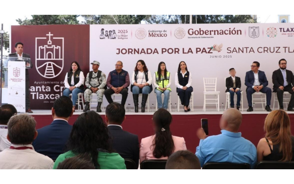 385 Grados / Santa Cruz Tlaxcala / REDACCIÓN / Con la participación de autoridades federales, estatales, municipales y representantes de la comunidad, este viernes se llevó a cabo el arranque de la Jornada de Paz en Santa Cruz Tlaxcala, encabezada por la presidenta honorífica del Sistema Estatal Para el Desarrollo Integral de la Familia (Sedif), Mariana Espinosa de los Monteros Cuellar, y el Secretario de Gobierno, Luis Antonio Ramírez Hernández, quienes destacaron los avances significativos en materia de seguridad y la importancia de la participación infantil en la recuperación del tejido social.