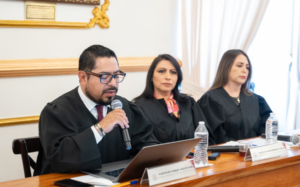 El Magistrado Enrique Acoltzi Conde, Presidente de la Sala Civil Familiar y Mercantil y titular de la tercera Ponencia, presentó el informe de resultados de esta Sala, acompañado de la Magistrada Anel Bañuelos Meneses y la Magistrada Mildred Murbartián Aguilar.