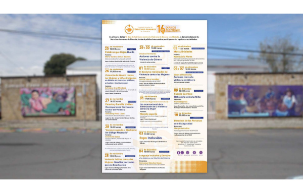 Asimismo, del 16 de diciembre al 10 de noviembre se transmitirá, en las redes de la CEDHT el programa “16 días, 16 voces contra la violencia”, dirigido por la consejera consultiva Leticia Valera González, en el que entrevistará a diferentes mujeres.