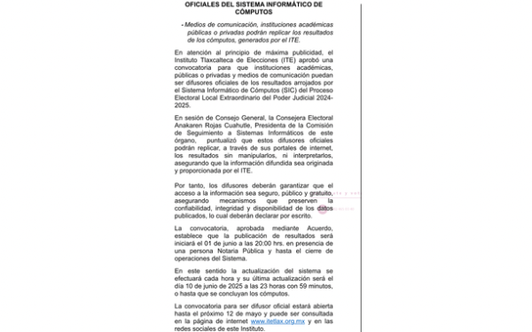 385 Grados / ITE / REDACCIÓN / En atención al principio de máxima publicidad, el Instituto Tlaxcalteca de Elecciones (ITE) aprobó una convocatoria para que instituciones académicas, públicas o privadas y medios de comunicación puedan ser difusores oficiales de los resultados arrojados por el Sistema Informático de Cómputos (SIC) del Proceso Electoral Local Extraordinario del Poder Judicial 2024-2025.