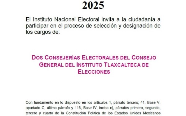 Lo anterior, a efecto de nombrar, por un periodo de siete años, a las dos consejerías electorales del Instituto Tlaxcalteca de Elecciones (ITE), que el próximo 31 de octubre quedarán vacantes por el término del nombramiento realizado por el Pleno del INE en el año 2018.