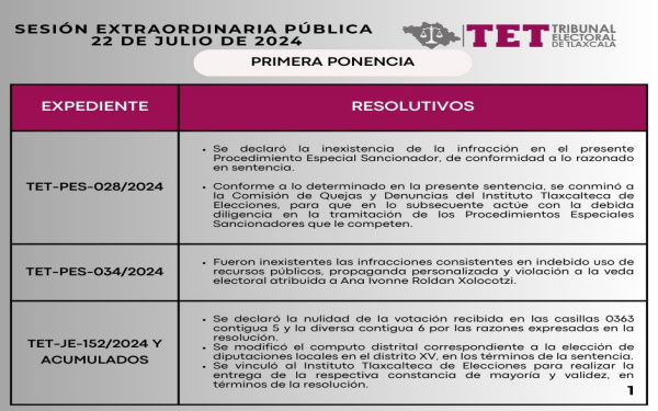 Los magistrados respaldaron el resolutivo presentado por Lino Noé Montiel Sosa, en el que declaró la nulidad de la votación recibida en las casillas 363 contigua 5 y la diversa contigua 6 de la elección de diputado en el distrito 15 de San Pablo del Monte.