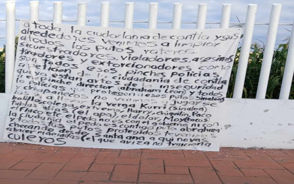 El mensaje, que apareció la mañana de este martes 8 de octubre frente a la Presidencia de Comunidad de la Sección Primera, advierte sobre una presunta «limpia» en la corporación policiaca, acusándola de coludir con grupos delictivos.