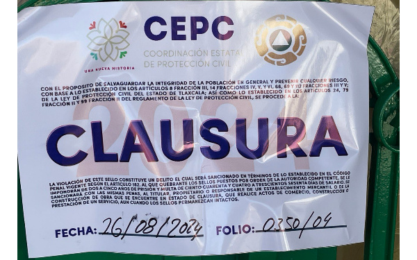 A través de un comunicado, la dependencia estatal informó que los sellos fueron colocados la mañana de este martes, 27 de agosto, pues durante las revisiones efectuadas por elementos de Protección Civil, los responsables no presentaron las constancias de capacitación de los cursos consignados en el cronograma previsto en el Programa Interno de Protección Civil ni tampoco evidenciaron las actividades establecidas en el cuadro programático de actividades señaladas en el documento.