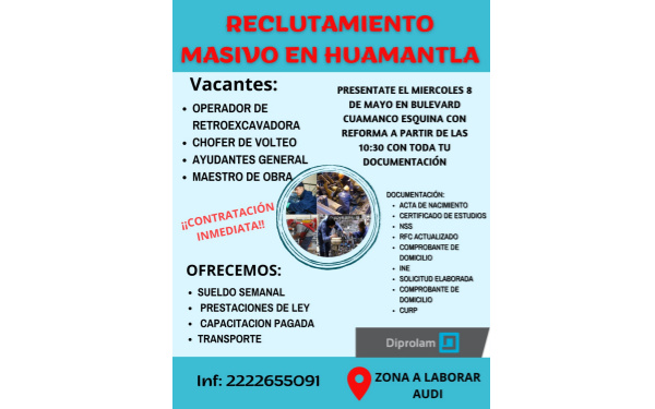 El H. Ayuntamiento de Huamantla, en coordinación con la empresa Diprolam, invita a hombres mayores de 18 años a participar en el proceso de reclutamiento de las vacantes de operador de retroexcavadora, chofer de volteo, ayudante general y maestro de obra.