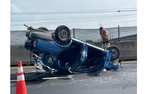385 Grados / Huamantla / Alexis P. González / Esta mañana se registró la volcadura de un vehículo Tsuru color azul, cuando circulaba sobre la carretera México – Veracruz a la altura de la comunidad de Lázaro Cárdenas en Huamantla.