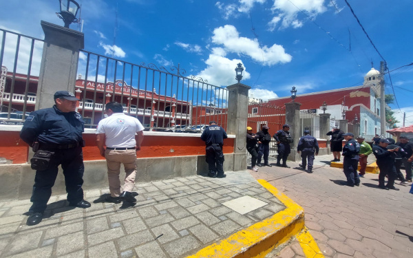 385Grados / Nanacamilpa / Alexis P. GONZÁLEZ / Elementos de Seguridad Pública del municipio y algunos trabajadores del Ayuntamiento de Nanacamilpa realizaron un paro de labores y cerraron el acceso a la presidencia municipal, presuntamente por la falta de pago de quincenas y otras promesas de apoyos a hijos de policías.