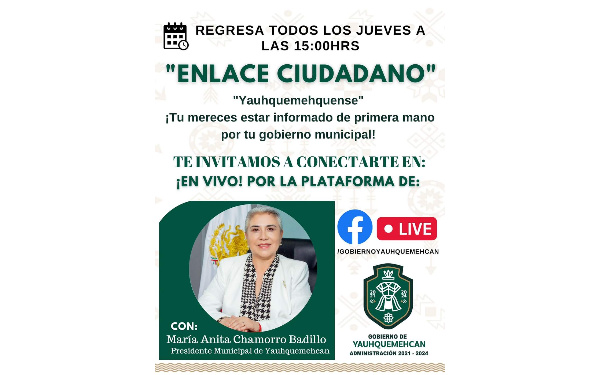 385 Grados / Yauhquemehcan/ REDACCIÓN/ El Gobierno de Yauhquemehcan 2021-2024 les invita a seguir este y todos los jueves alrededor de las 15:00 horas, en espacio virtual de información «Enlace Ciudadano» Infórmate de las acciones del Gobierno Municipal, que buscan atender prioritariamente tus necesidades.