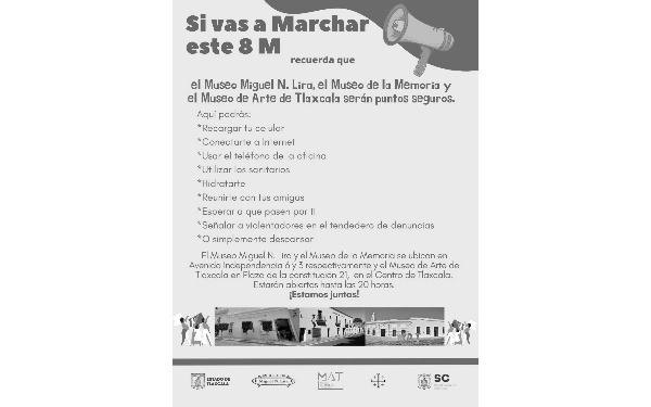 385 Grados / Tlaxcala / Maire PISCIL/ El Museo Miguel N. Lira, el Museo de la Memoria y el Museo de Arte de Tlaxcala (MAT) ubicados en el primer cuadro de la ciudad capital serán puntos seguros en la marcha #8M en conmemoración del Día internacional de la Mujer este viernes ocho de marzo, los cuales permanecerán abiertos hasta las 20 horas.
