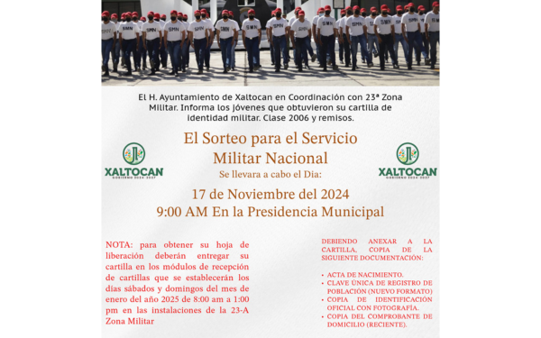 385 Grados / Xaltocan / REDACCIÓN / La Secretaría de la Defensa Nacional, en coordinación con el H. Ayuntamiento de Xaltocan y la 23ª Zona Militar, ha anunciado que el sorteo del Servicio Militar Nacional para los jóvenes de la clase 2006 y remisos se llevará a cabo el próximo 17 de noviembre de 2024, a las 9:00 a.m. en la Presidencia Municipal de Xaltocan.