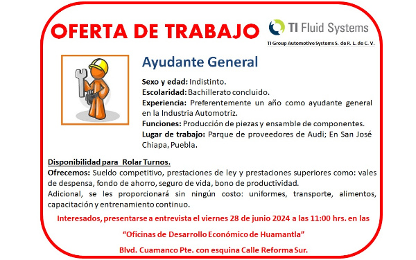 El H. Ayuntamiento de Huamantla, que preside Luz María Calva Pimentel, en colaboración con la empresa TI Fluid Systems del ramo automotriz, anuncia que realizará reclutamiento para contratar a personal como ayudantes generales, este viernes 28 de junio.