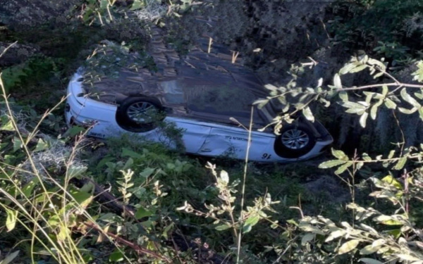 Aparentemente, la gravilla suelta aunado a posible exceso de velocidad propiciaron que el taxi con número económico 16, y base en Nanacamilpa, quedara fuera de la cinta asfáltica con llantas hacia arriba.