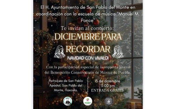 El H. Ayuntamiento de San Pablo del Monte, en colaboración con la escuela de música «Manuel M. Ponce», anunció la realización del concierto «Diciembre para Recordar: Navidad con Vivaldi», un evento que promete ser un deleite musical para los asistentes.