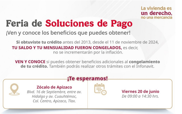 385Grados / Apizaco / REDACCIÓN / El Gobierno municipal de Apizaco en coordinación con el Instituto del Fondo Nacional de la Vivienda para los Trabajadores (Infonavit) en Tlaxcala, invita a las y los derechohabientes del municipio a participar en la Feria de Soluciones de Pago, un evento diseñado para brindar apoyo a personas con créditos activos.