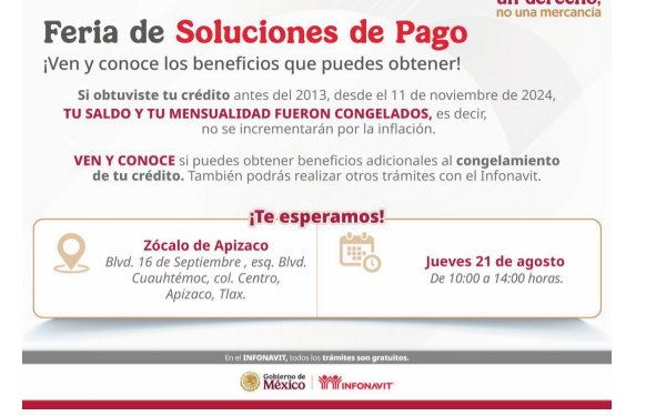 385Grados / Apizaco / REDACCIÓN / Con el objetivo de promover mejores condiciones de vivienda, acercar los servicios a las y los trabajadores y apoyar el patrimonio de las familias, el Ayuntamiento de Apizaco, encabezado por el presidente municipal Javier Rivera Bonilla, invita a la ciudadanía a la Feria de Atención del Instituto del Fondo Nacional de la Vivienda para los Trabajadores (Infonavit), que se llevará a cabo el próximo jueves 21 de agosto en el zócalo de la ciudad rielera.