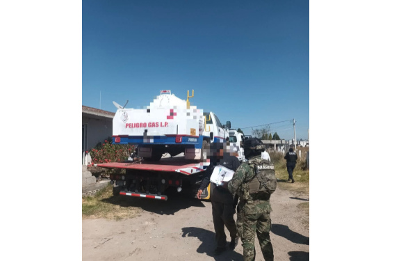 La intervención se llevó a cabo tras la ejecución de una orden de cateo, donde los elementos policiales localizaron dos pipas, un camión y diversos tanques de gas presuntamente empleados para actividades ilícitas relacionadas con la comercialización de hidrocarburo.