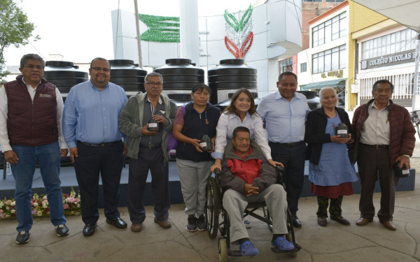 385Grados / Apizaco / REDACCIÓN / La presidenta honorífica del Comité Consultivo de Bienestar Estatal, Fernanda Espinosa de los Monteros Cuellar, Rubén Espinosa Mejía, director de Participación Social; el presidente de Apizaco, Javier Rivera Bonilla, y el secretario de Ayuntamiento, Juan Pablo Morales Rico, presidieron la entrega de 176 tinacos que beneficiarán a las familias apizaquenses que más lo necesitan para mejorar su calidad de vida.