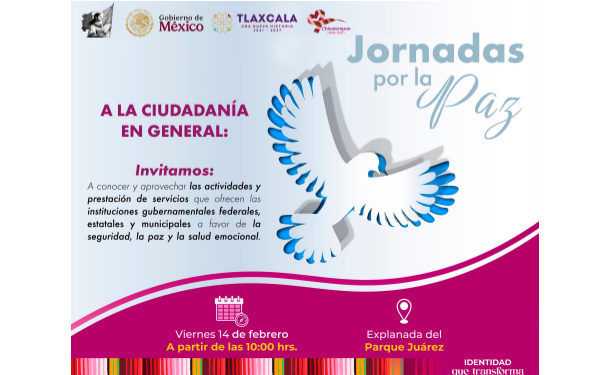385 Grados / Chiautempan / REDACCIÓN / El próximo viernes 14 de febrero, la explanada del Parque Juárez en Chiautempan será el punto de encuentro para la Jornada por la Paz, un evento dedicado a la concientización y promoción de servicios para el bienestar de la comunidad.