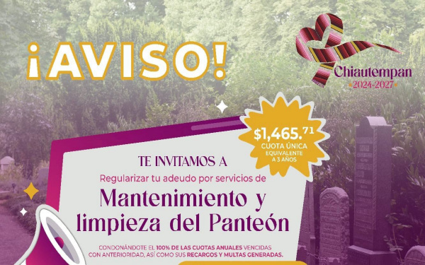 385Grados / Chiautempan / REDACCIÓN / La presidencia de Chiautempan implementó un programa de descuento de pagos de mantenimiento y predial de lotes del Panteón Municipal a fin de que las familias regularicen sus espacios, tengan certeza jurídica y se ahorren multas y recargos, informó la alcaldesa Blanca Angulo Meneses.