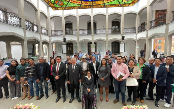 385 Grados / Congreso / REDACCIÓN / En el Patio Vitral del Congreso del Estado, la diputada Gabriela Hernández Islas, presidenta de la Comisión de Derechos Humanos, Grupos Vulnerables y Derechos de las Niñas, Niños y Adolescentes, encabezó el Foro “El derecho al voto de las presidencias de comunidad: un adeudo constitucional”, marco en el que realizó la entrega formal de una propuesta de reforma constitucional que busca restituir este derecho a las autoridades comunitarias.