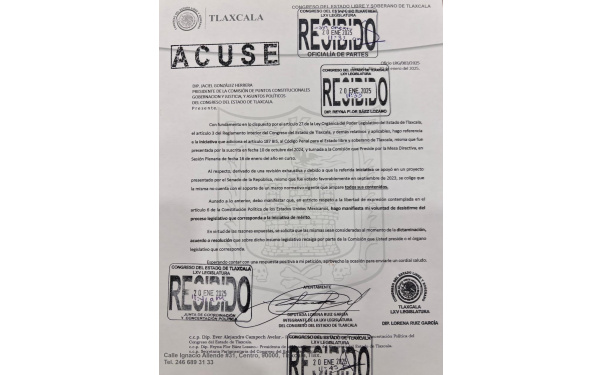 Lo anterior, aseguró la legisladora en estricto respeto a la libertad de expresión contemplada en la Constitución Política de los Estados Unidos Mexicanos. El oficio se refiere a la iniciativa en la que propuso una reforma y adición al Artículo 187 BIS al Código Penal para el Estado Libre y Soberano de Tlaxcala, en la que buscaba tipificar como delito, la difusión indebida de imágenes relacionadas con procesos penales.