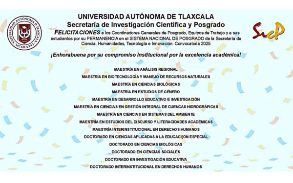385 Grados / UATx / REDACCIÓN / 14 programas de Maestría y Doctorado de la Universidad Autónoma de Tlaxcala cumplieron con los lineamientos requeridos para ser dictaminados de manera favorable para su permanencia en el Sistema Nacional de Posgrados (SNP) de la Secretaría de Ciencia, Humanidades, Tecnología e Innovación (SECIHTI), en la evaluación que corresponde a la convocatoria 2025 con una vigencia de tres años.