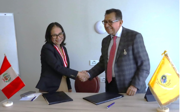 En su reciente visita a ese país andino, el Doctor Serafín Ortiz Ortiz, y la Doctora Lida Ascencio Trujillo, Rectora de la UNE, formalizaron esta alianza internacional que es relevante para el intercambio de estudiantes, docentes y personal administrativo.