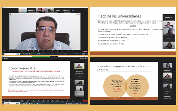 En su disertación, el Doctor Gorjón Gómez recalcó que en este momento se visualiza la paz desde un punto de vista filosófico y epistemológico, lo que ha generado que las instituciones de formación profesional tengan que generar y desarrollar protocolos de cultura de paz, de ahí el reto de las universidades de lograr la transversalización de la paz al interior de las mismas, toda vez que este concepto es uno de los 17 objetivos incluidos en la agenda 2030 de la Organización de Naciones Unidas (ONU).