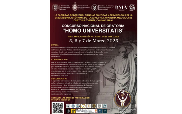 385 Grados / UATx / REDACCIÓN / En el mes de marzo la Universidad Autónoma de Tlaxcala (UATx) será sede del concurso nacional de Oratoria “Homo Universitatis” que tiene como propósito fomentar la oralidad entre estudiantes de diversas disciplinas y promover el diálogo y la cultura, bajo la organización de la Facultad de Derecho, Ciencias Políticas y Criminología, la Barra Mexicana Colegio de Abogados (BMA), la Academia Mexicana de Oratoria Forense y diferentes universidades del país, en el marco del Día Nacional de la Oratoria.