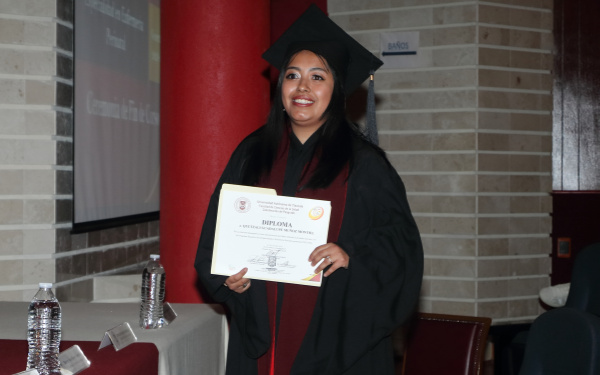 Ante la estructura directiva de la Institución, de la Facultad y de familiares de los graduados, la estudiante Quetzali Guadalupe Muñoz Montiel, quien fue galardonada por haber obtenido el mejor promedio de su generación y en representación de los egresados, reconoció el compromiso de esta Casa de Estudios por brindar una formación de calidad y agradeció a los docentes la dedicación y entrega para compartir su experticia en el aula y contribuir a una formación que les permita enfrentar los retos que impone la globalización en el tema de la salud pública.