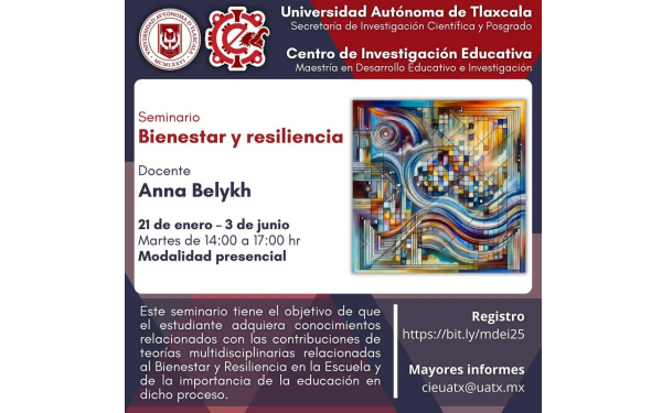 Con el objetivo de que el estudiante adquiera conocimientos relacionados con las contribuciones de teorías multidisciplinarias relacionadas con el bienestar y resiliencia en la escuela y de la importancia de la educación en dicho proceso, el Centro de Investigación Educativa (CIE) de la Universidad Autónoma de Tlaxcala (UATx), impartirá el seminario “Bienestar y resiliencia” a cargo de la Doctora Anna Belykh.