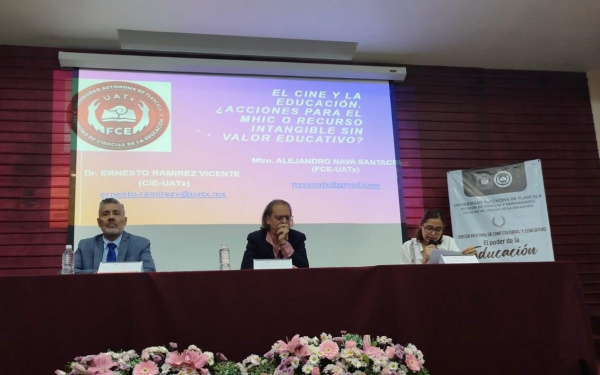 En esta misma línea, el Doctor en Sociología, Ernesto Ramírez Vicente, proveniente de Madrid, España, y actual profesor-investigador en el Centro de Investigación Educativa (CIE) de la UATx, sus líneas de investigación giran en torno a la educación, a nivel histórico y sociológico y, de manera secundaria, en torno a la historia, la sociología política, el desarrollo, el cine y la historia del arte. En conjunto con el Maestro Alejandro Nava Santacruz, docente de la Facultad y doctorante del CIE, realizaron el conversatorio debate “El cine y la educación. ¿Acciones para el MHIC o recurso intangible sin valor educativo?”