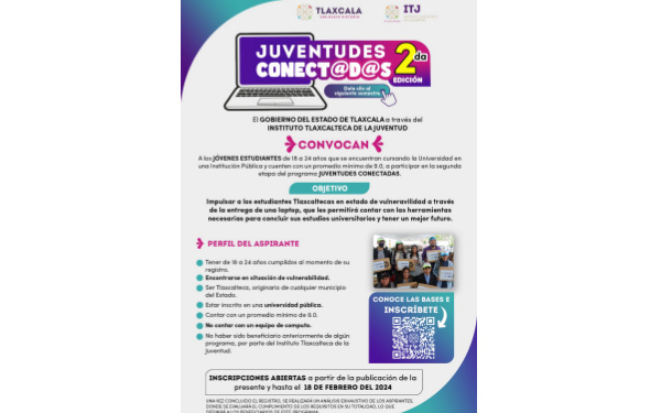 Por ello, por segundo año consecutivo, entregará computadoras gratuitas tipo laptop a la juventud tlaxcalteca como parte del programa Juventudes Conectadas 2024.