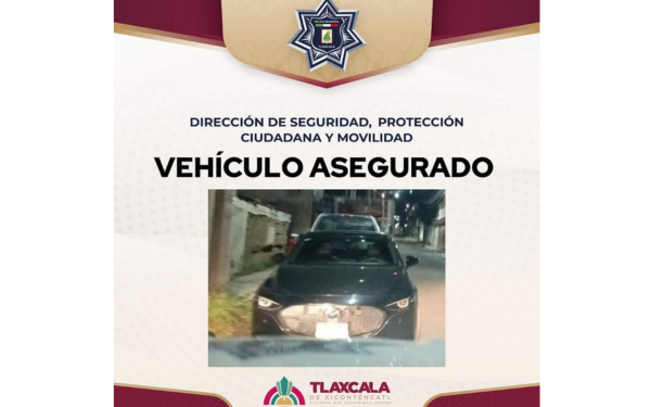 385 Grados / Tlaxcala / REDACCIÓN / Como parte de las acciones permanentes de vigilancia y verificación, elementos de la policía municipal de Tlaxcala detectaron y aseguraron un vehículo sospechoso marca Mazda modelo 2023 que presentaba diversos antecedentes legales, entre ellos un reporte de robo y un embargo vigente.