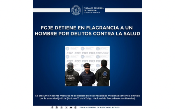 385 Grados / FGJE / REDACCIÓN / La Policía de Investigación, adscrita a la Fiscalía General de Justicia del Estado (FGJE), detuvo en flagrancia a Jazzmany N., por su probable responsabilidad en delitos contra la salud, en el municipio de Panotla.