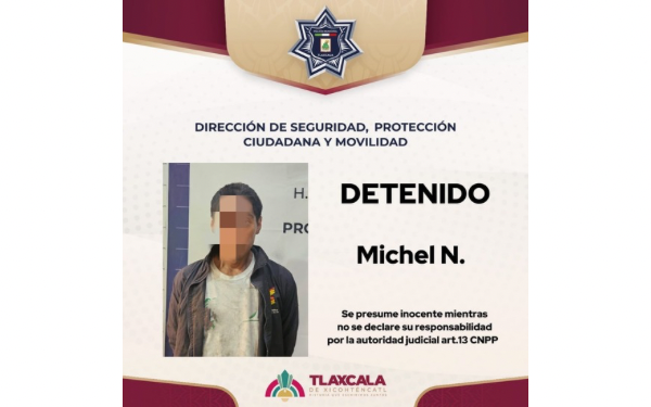 385 Grados / Tlaxcala / REDACCIÓN / Elementos de la Dirección de Seguridad Pública Municipal pusieron a disposición a un masculino de 32 años de edad, identificado como Michel N., por alterar el orden público y cometer faltas a la autoridad, durante una intervención realizada en la comunidad de San Gabriel Cuauhtla.