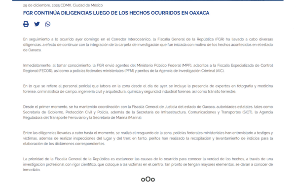 Actualización por parte de la FGR sobre el descarrilamiento del Tren Interoceánico
