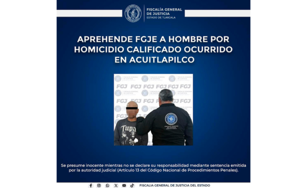 385 Grados / FGJE  / REDACCIÓN / Derivado de labores de inteligencia realizadas por la Policía de Investigación, la Fiscalía General de Justicia del Estado (FGJE) aprehendió a Juan N., por su probable responsabilidad en el delito de homicidio calificado, ocurrido en el municipio de Tlaxcala.