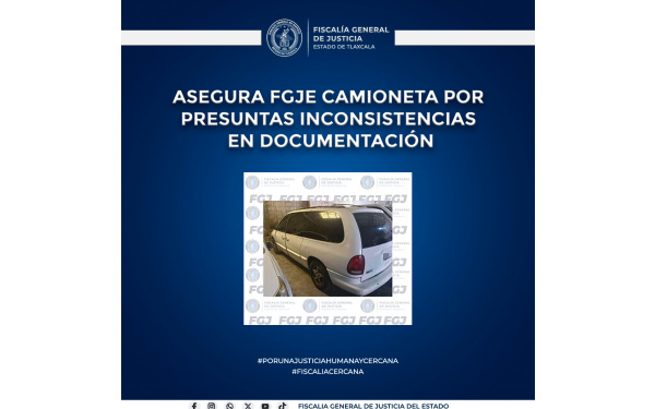 385 Grados / FGJE / REDACCIÓN / Elementos de la Policía de Investigación de la Fiscalía General de Justicia del Estado (FGJE) aseguraron una camioneta marca Dodge, tipo Voyager, modelo 1997, por presuntas inconsistencias en la documentación presentada para un trámite de reemplacamiento.