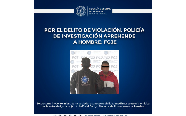 Una vez obtenido el mandamiento judicial, elementos de la Policía de Investigación realizaron labores de búsqueda y el hombre fue detenido en el municipio de Apizaco, donde le hicieron saber los derechos que le asisten como persona detenida, así como el motivo de su detención.