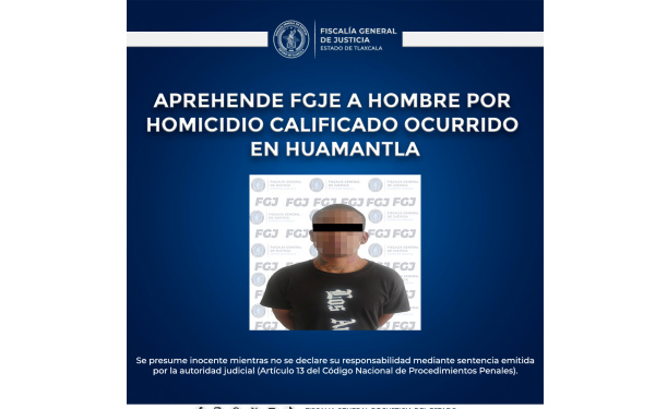 385 Grados / FGJE / REDACCIÓN / Como resultado del trabajo de inteligencia realizado por la Policía de Investigación, la Fiscalía General de Justicia del Estado (FGJE) aprehendió a Ulises N., probable responsable del delito de homicidio calificado, ocurrido en el municipio de Huamantla en agravio de dos hombres.