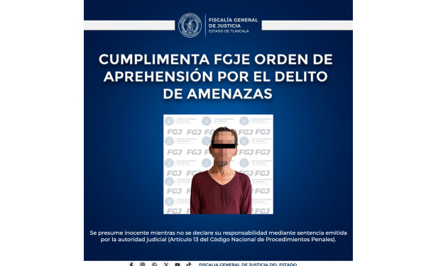 385 Grados / FGJE / REDACCIÓN / La Fiscalía General de Justicia del Estado (FGJE), a través de la Policía de Investigación, cumplimentó una orden de aprehensión en contra de Alejandro N., por su probable responsabilidad en el delito de amenazas.