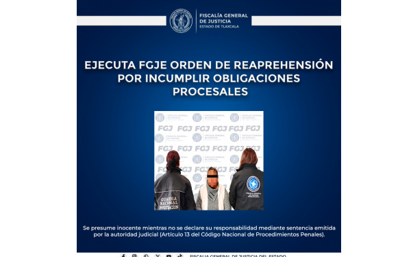 385 Grados / FGJE / REDACCIÓN / Elementos de la Policía de Investigación de la Fiscalía General de Justicia del Estado (FGJE) ejecutaron una orden de reaprehensión en contra de Agustina N., por incumplir las obligaciones procesales impuestas por un Juez Penal del sistema tradicional, dentro del proceso que enfrenta por el delito de despojo.