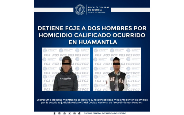 385 Grados / FGJE / REDACCIÓN / Gracias a labores de inteligencia de la Policía de Investigación, la Fiscalía General de Justicia del Estado (FGJE) aprehendió a Alexsander N. y Flavio César N., por su probable participación en el delito de homicidio calificado, ocurrido en Huamantla.