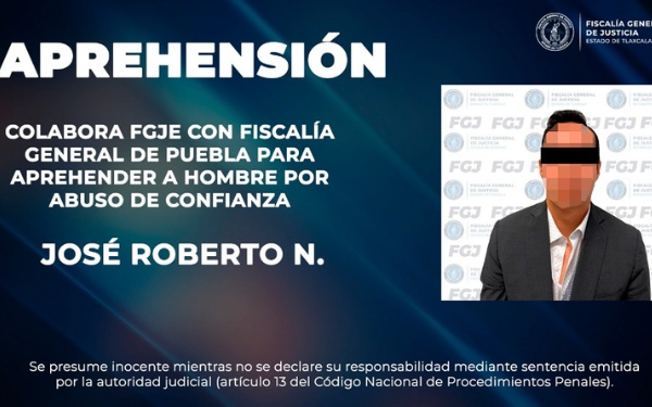 385 Grados / FGJE / REDACCIÓN / La Fiscalía General de Justicia del Estado (FGJE) y la Fiscalía General del Estado de Puebla (FGE) cumplimentaron una orden de aprehensión en contra de José Roberto N., por su probable responsabilidad en el delito de abuso de confianza, en agravio de una empresa ubicada en el municipio de Huejotzingo, estado de Puebla.